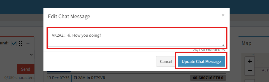 Click the edit button and a dialog box will appear. Here you can edit your message and then click the “Update Chat Message” button to submit it.